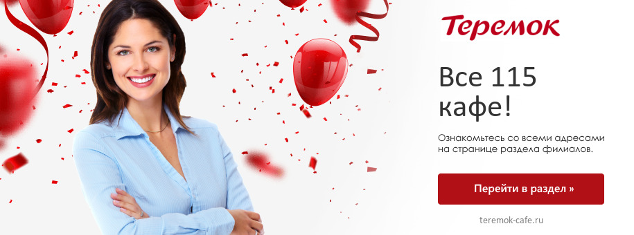 На нашем сайте Вы можете найти кафе Теремок в своем городе, посмотреть актуальный каталог товаров Теремок и ознакомиться с акциями Теремок.
